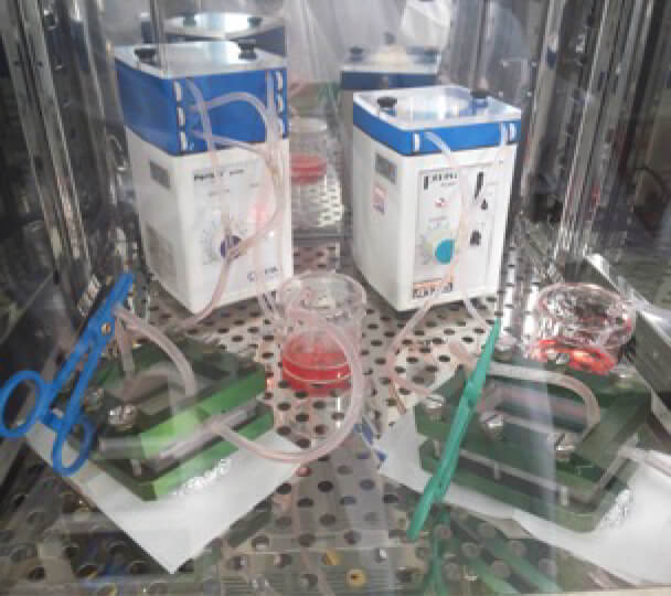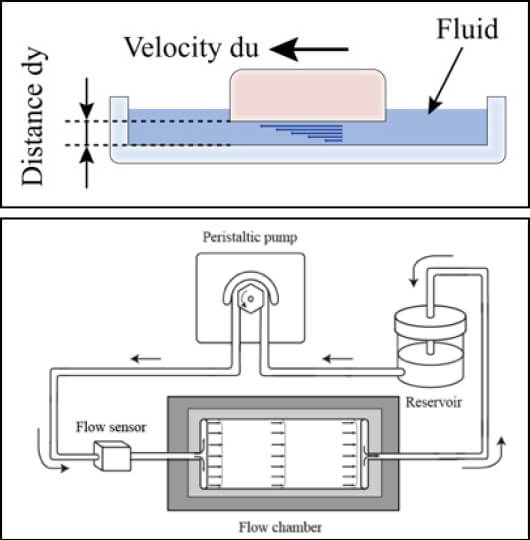 ヒト角膜上皮細胞をガラス板上に播種、コンフルエント状態まで培養して平行平板型フローチャンバーに設置し、水流によるシェアストレスを負荷する。フローチャンバーの構造に基づき、細胞に作用するシェアストレス(τ、dyne/cm²)は、τ = μ6Q/a²b (μは培地の粘度(ポアズ)、Qは体積流量(mL/s)、a,bはチャンネルの高さと幅(cm))の式で計算される。流速は超音波移動時間式流量センサーにより確認し、24時間のフロー曝露後、ガラス板をチャンバーから取り出し、PBSで洗浄後、細胞を回収、P C RやW Bなどを中心とした解析を行っている。