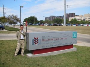 2005年4月より2007年3月までの2年間、米国テキサス州にあるテキサスA&M大学に留学させて頂きました。私が留学していた時期はちょうど新研修制度導入により新入医局員がおらず、医局にとって未曾有の人手不足で大変な時期でありましたが、このような状況下でも快く留学に送り出して頂いた吉田先生はじめ医局の先生方には大変感謝しております。私の留学先は、日本では無名のテキサスA&M大学で、しかも研究所は大学の本部から200km程離れた田舎町にあり、総勢50名足らずの小さなものでした。その分、スタッフは皆フレンドリーで、私のような英語の下手な異国人にとっても大変仕事のしやすい環境でもありました。私のテキサスでの上司・Lih Kuo教授は台湾出身のPhDで、台湾の大学を卒業後、国籍や体のハンディキャップをものともせずに努力を重ね、微小循環の世界において超一流の研究者に上り詰め、アメリカンドリームを実現された先生です。先生はもともと心臓の微小血管の専門家でしたが、好奇心が大変旺盛で、新しく網膜での研究プログラムを立ち上げられ、タイミング良くそこに私が参加させていただいたことになります。明晰な頭脳をフルに働かせ、学問に対して常に真摯に取り組む先生の姿勢には学ぶところがたくさんありました。