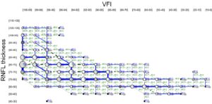 2 dimensional continuous-time hidden Markov model(Fig.2)という疾患進行予測モデルを緑内障に当てはめて、その臨床性能(予測能)を評価するというものです。モデルはコラボレーターであるジョージア工科大学の研究者に作成して頂き、その臨床応用を行うのが僕の研究テーマの一つでした。このモデルでは、OCT(網膜神経線維厚)による構造変化と視野検査(visual field index, VFI)による機能変化という、これまで別々に評価していた二次元情報(=2 dimensional)を同時に考慮し、疾患の進行を予測することができます。少し内容が難しいですが、簡単に言うと、“OCTと視野検査の情報から、数年後にその患者さんがどのくらい進行するか 予測できますよ”というモデルです。ちなみにその予測性能ですが、GPA(guided progression analysis)などの直線回帰を用いる従来の方法よりは、遥かに精度は高く、今後さらなる発展が期待されます(Ophthalmology 2018)。