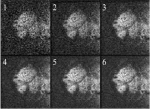 Spectralisに搭載されているARTを筆頭に各社がOCT画像の“見え方”を向上させるため加算平均法をよく用いています。しかし、これまでの方法では、 eye movement trackingを用いて“事前に”加算平均用のデータをまとめて取得することが絶対条件でした。しかし、我々はその前提条件が必要のない加算平均法、つまり、複数回のセッションに分けて撮影した“事後”のデータを用いることのできる加算平均方法を構築しました。さらに、加算するのは二次元情報ではなく、3次元のcube dataになります。このアルゴリズムを用いることで、無加算(single image)のものに比べ2,3,..,6枚と加算するに従い、視神経乳頭の“見え方”が鮮明になることを確認しました。